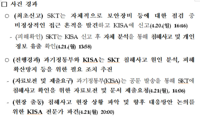 27일 국회 과학기술정보방송통신위원회 소속 최수진 의원(국민의힘)이 KISA로부터 제출받은 'SKT 인터넷 해킹사건 관련 신고서 및 사건경과' 자료에 따르면 SK텔레콤이 해킹 피해 사실을 신고한 시점은 지난 20일 오후 4시 46분이고, 사건 인지 시점은 이보다 한 시간 정도 앞선 오후 3시 30분으로 기록됐다.