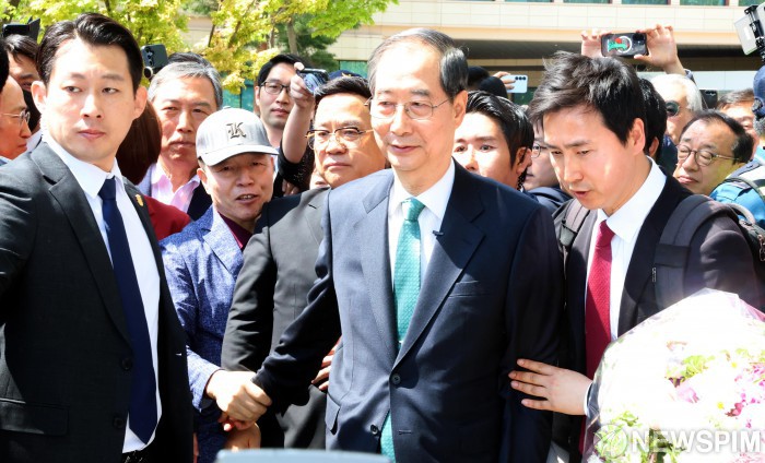 [서울=뉴스핌] 윤창빈 기자 = 한덕수 전 국무총리가 2일 오전 서울 여의도 국회에서 대선 출마 선언을 마치고 나서고 있다. 2025.05.02 pangbin@newspim.com