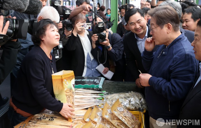 [인제=뉴스핌] 최지환 기자 = 이재명 더불어민주당 대선 후보가 '골목골목 경청투어' 접경지역 방문 이틀째인 2일 오후 강원 인제군 원통시장에서 황태포를 시식하고 있다. 2025.05.02 choipix16@newspim.com