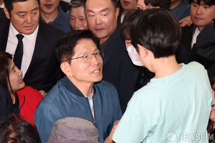 [의정부=뉴스핌] 이형석 기자 = 김문수 국민의힘 대선 후보가 4일 경기 의정부시 의정부제일시장을 방문해 한 아이와 인사하고 있다. 2025.05.04 leehs@newspim.com