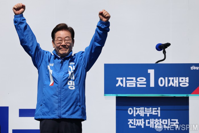 [서울=뉴스핌] 정일구 기자 = 이재명 더불어민주당 대선 후보가 12일 오전 서울 청계광장에서 열린 중앙선거대책위원회 출범식 및 첫 유세에서 지지자들을 향해 손을 흔들고 있다. 2025.05.12 mironj19@newspim.com
