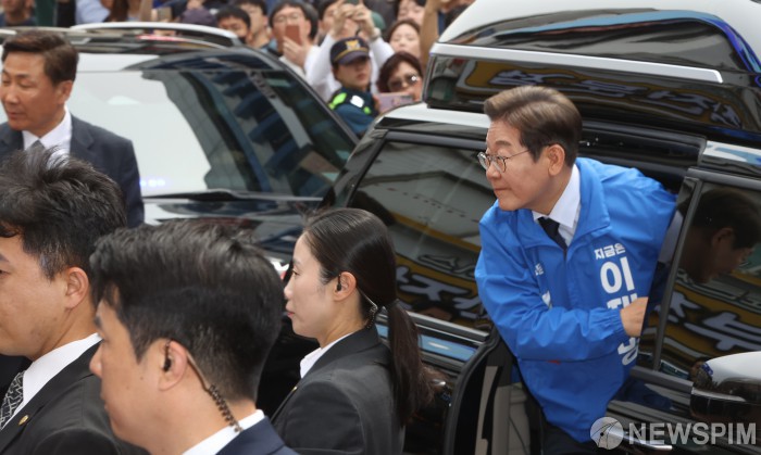 [대구=뉴스핌] 정일구 기자 = 더불어민주당 이재명 대선후보가 13일 대구 동성로에서 열린 '대구 집중유세'에 참석해 차에서 내리고 있다. 2025.05.13 mironj19@newspim.com