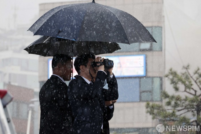 [여수=뉴스핌] 김학선 기자 = 경호원들이 많은 비가 내린 15일 오후 전남 여수시 이순신 광장에서 이재명 대선후보를 경호하고 있다. 2025.5.15 yooksa@newspim.com