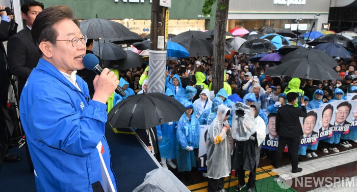 [순천=뉴스핌] 김학선 기자 = 이재명 더불어민주당 대선 후보가 15일 쏟아지는 비에도 불구하고 수많은 인파가 운집한 전남 순천시 연향동 패션의거리에서 지지를 호소하고 있다. 2025.05.15 yooksa@newspim.com