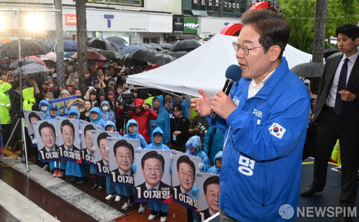 [순천=뉴스핌] 김학선 기자 = 이재명 더불어민주당 대선 후보가 15일 쏟아지는 비에도 불구하고 수많은 인파가 운집한 전남 순천시 연향동 패션의거리에서 지지를 호소하고 있다. 2025.05.15 yooksa@newspim.com