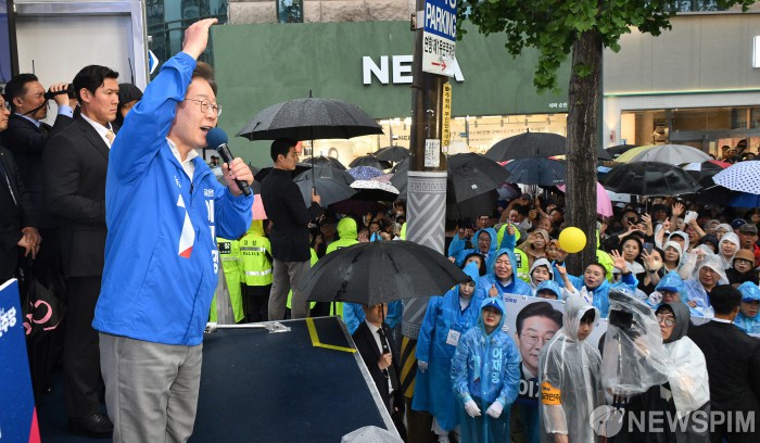 [순천=뉴스핌] 김학선 기자 = 이재명 더불어민주당 대선 후보가 15일 쏟아지는 비에도 불구하고 수많은 인파가 운집한 전남 순천시 연향동 패션의거리에서 지지를 호소하고 있다. 2025.05.15 yooksa@newspim.com