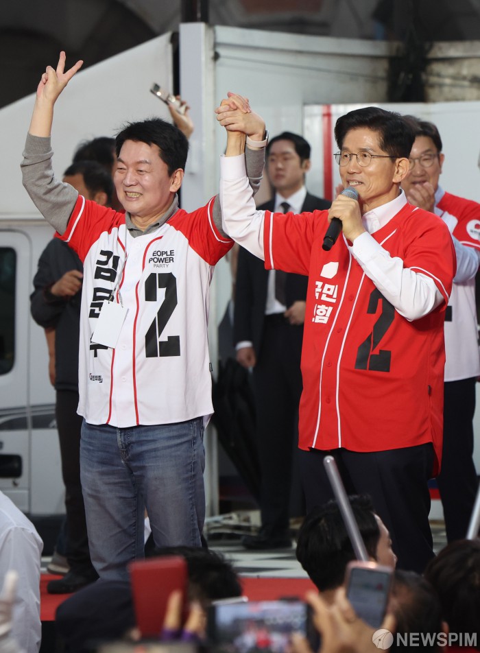[서울=뉴스핌] 최지환 기자 = 김문수 국민의힘 대선후보가 19일 오후 서울 용산구 서울역 광장에서 열린 유세에서 안철수 대통령후보자 정치고문과 인사를 하고 있다. 2025.05.19 choipix16@newspim.com