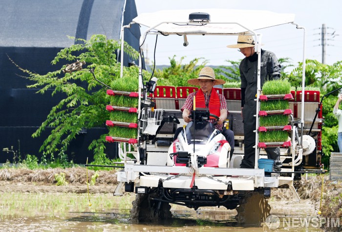 [고양=뉴스핌] 최지환 기자 = 김문수 국민의힘 대선후보가 21일 오후 경기 고양시 덕양구 화정동 일대 논에서 청년농업인과 이앙기에 탑승해 모내기를 하고 있다. 2025.05.21 choipix16@newspim.com