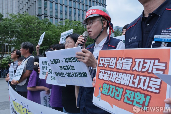 [서울=뉴스핌] 이길동 기자 = 탈석탄법 제정을 위한 시민사회연대 관계자들이 22일 오전 서울 종로구 광화문 이순신 장군 동상 앞에서 기후위기 극복을 위한 정의로운 탈석탄법 제정 축구 기자회견을 하고 있다. 2025.05.22 gdlee@newspim.com