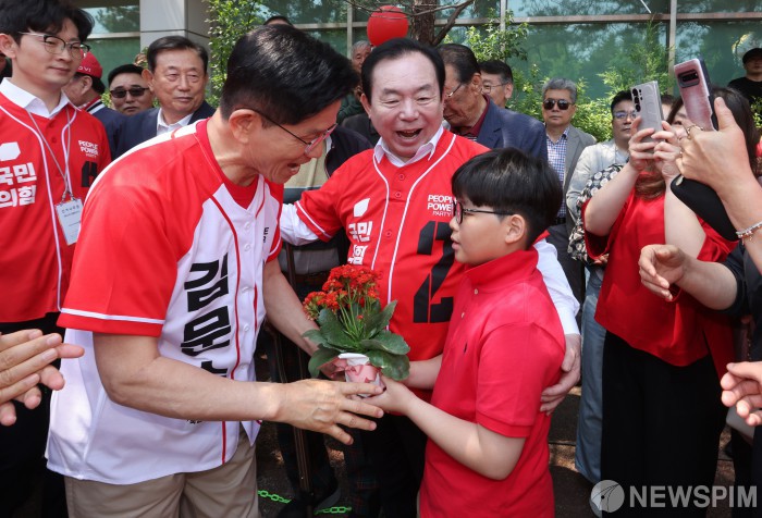 [논산=뉴스핌] 최지환 기자 = 김문수 국민의힘 대선후보가 25일 오전 충남 논산시 홈플러스 논산점 앞에서 열린 유세 현장에서 한 어린이에게 꽃을 선물받고 있다. 2025.05.25 choipix16@newspim.com