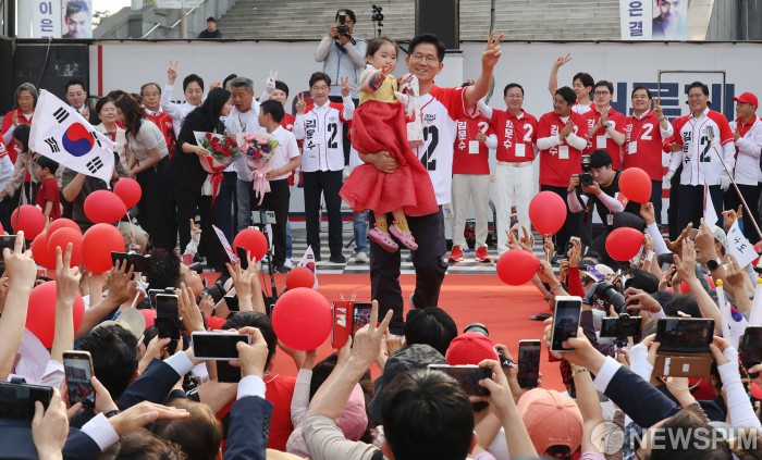 [용인=뉴스핌] 최지환 기자 = 김문수 국민의힘 대선 후보가 26일 오후 경기 용인 포은아트갤러리 광장에서 열린 “내일의 기적을 만들” 집중유세에서 한 아이를 안아주며 유권자들에게 인사하고 있다. 2025.05.26 choipix16@newspim.com