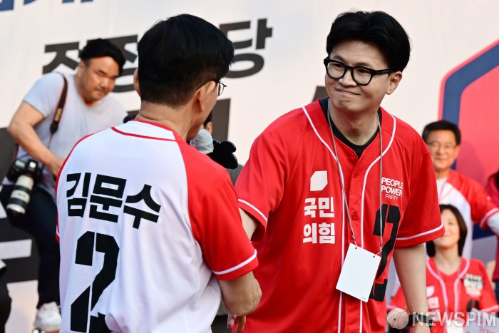 [서울=뉴스핌] 최지환 기자 = 한동훈 전 국민의힘 대표가 26일 오후 서울 도봉구 방학사거리에서 열린 김문수 국민의힘 대선 후보의 노원·도봉·강북 집중유세 현장을 찾아 김 후보와 악수하고 있다. 2025.05.26 choipix16@newspim.com