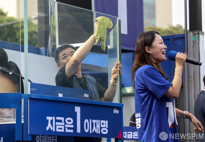 [서울=뉴스핌] 정일구 기자 = 28일 서울 광진구 어린이대공원 앞에서 열린 이재명 더불어민주당 대선 후보 유세 현장에서 캠프 관계자가 방탄유리를 닦고 있다. 2025.05.28 mironj19@newspim.com