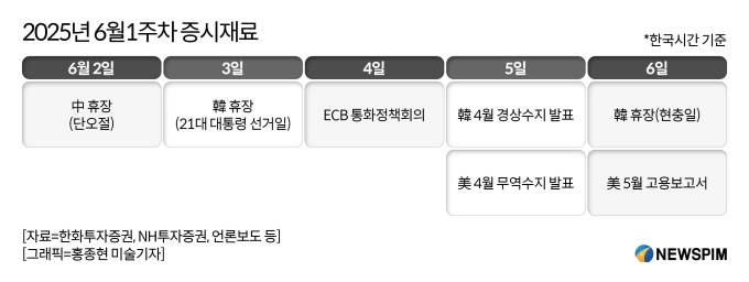 이번 주에는 중국이 2일 '단오절'을 맞아 휴장에 들어가며, 한국은 3일 '21대 대통령 선거'와 6일 '현충일'을 기념해 휴장한다. 4일에는 유럽중앙은행(ECB) 통화정책회의가 열리며, 5일에는 한국 4월 경상수지와 미국 4월 무역수지가 발표된다. 6일에는 미국 고용보고서 발표가 예정돼 있어, 이들 발표가 증시에 영향을 미칠 전망이다.
