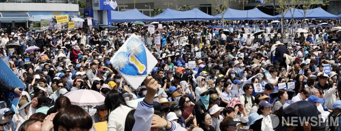 [대구=뉴스핌] 윤창빈 기자 =1일 오후 대구 동구 동대구역 광장에서 열린 이재명 더불어민주당 대통령 후보 유세에 인파가 모여 있다. 2025.06.01 pangbin@newspim.com