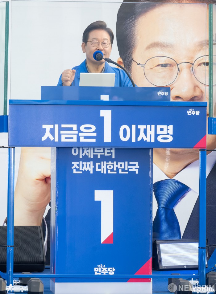 [부산=뉴스핌] 윤창빈 기자 = 이재명 더불어민주당 대선후보가 1일 부산역 광장에서 열린 집중유세에 참석, 유권자들의 지지를 호소하고 있다. 2025.06.01 pangbin@newspim.com