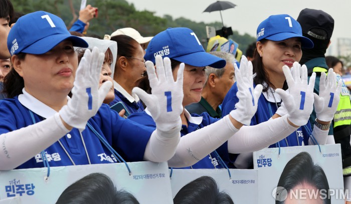 [서울=뉴스핌] 정일구 기자 = 제21대 대통령 선거를 하루 앞둔 2일 서울 강북구 북서울꿈의숲 서문광장에서 열린 이재명 더불어민주당 대선 후보의 유세장에서 운동원들이 지지를 호소하고 있다.2025.06.02 mironj19@newspim.com