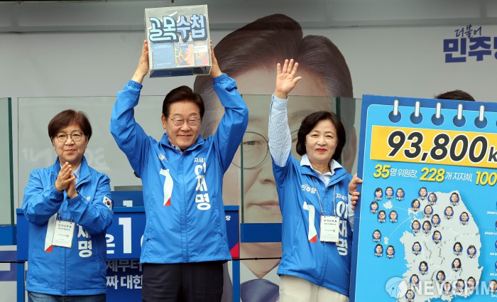 [하남=뉴스핌] 정일구 기자 = 이재명 더불어민주당 대선 후보가 2일 경기 하남시 스타필드 하남점 앞 광장에서 열린 유세에서 골목수첩 모음 상자를 전달받고 있다. 2025.06.02 mironj19@newspim.com