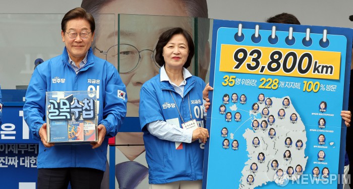 [하남=뉴스핌] 정일구 기자 = 이재명 더불어민주당 대선 후보가 2일 경기 하남시 스타필드 하남점 앞 광장에서 열린 유세에서 골목수첩 모음 상자를 전달받고 있다. 2025.06.02 mironj19@newspim.com