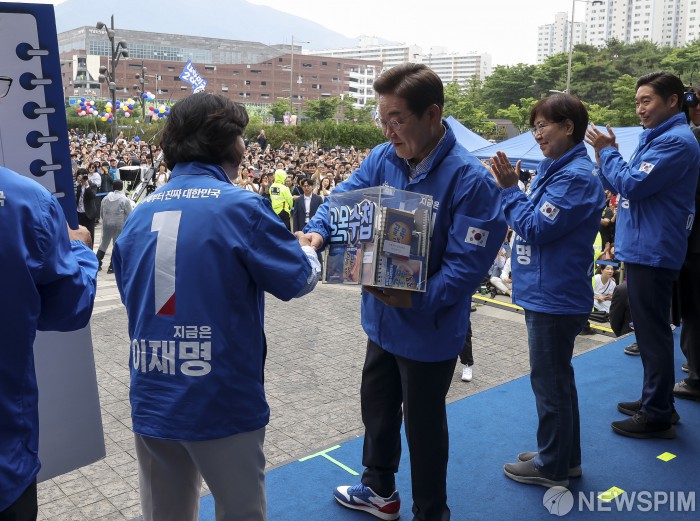 [하남=뉴스핌] 정일구 기자 = 더불어민주당 이재명 대선 후보가 2일 경기 하남시 스타필드 하남점 앞 광장에서 열린 유세에서 골목수첩 모음 상자를 전달받고 있다. 2025.06.02 mironj19@newspim.com