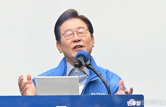 [성남=뉴스핌] 정일구 기자 = 이재명 더불어민주당 대선 후보가 2일 오후 경기 성남시 야탑역 광장에서 열린 선거유에서 연설을 하고 있다. 2025.06.02 mironj19@newspim.com