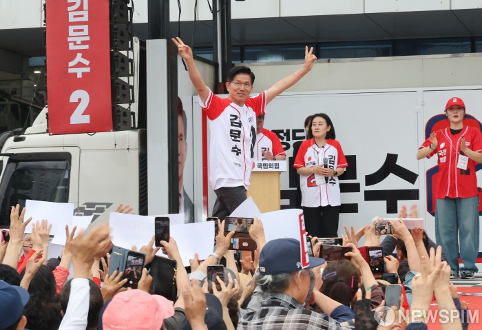 [대전=뉴스핌] 윤창빈 기자 = 김문수 국민의힘 대선 후보가 2일 오후 대전 동구 대전역 서광장에서 열린 "울려라 함성, 들어라 승리의 메아리" 총괄거점유세에서 유권자들에게 지지를 호소하고 있다. 2025.06.02 pangbin@newspim.com