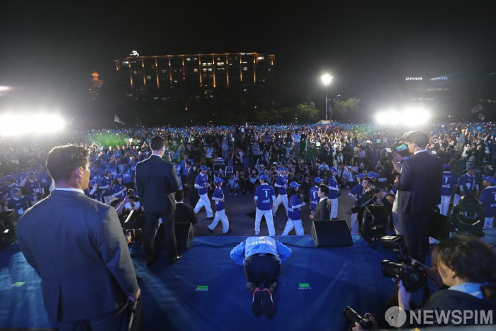 [서울=뉴스핌] 정일구 기자 = 이재명 더불어민주당 대선 후보가 2일 오후 서울 여의도공원 문화의마당에서 열린 집중유세에 참석, 지지자들을 향해 큰절을 하고 있다. 2025.06.02 mironj19@newspim.com