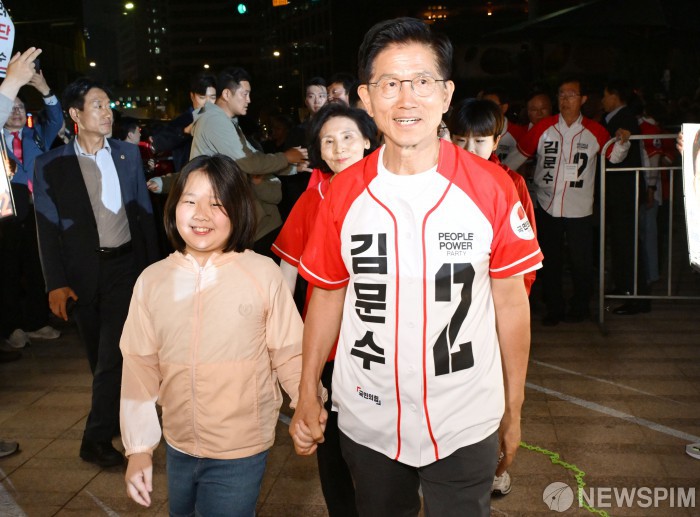 [서울=뉴스핌] 윤창빈 기자 = 김문수 국민의힘 대선 후보가 2일 서울광장에서 열린 피날레 유세에서 가족들과 입장하고 있다. 2025.06.02 pangbin@newspim.com