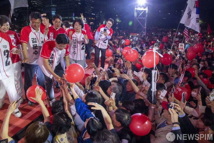 [서울=뉴스핌] 윤창빈 기자 = 김문수 국민의힘 대통령 후보가 2일 오후 서울 중구 서울시청 앞 광장에서 열린 '울려라 함성, 들어라 승리의 메아리' 피날레 유세에서 지지자들과 악수하고 있다. 2025.06.02 pangbin@newspim.com