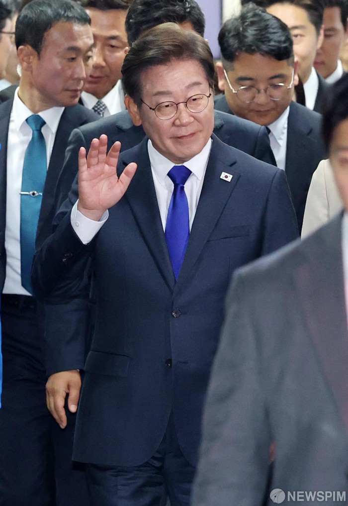 [서울=뉴스핌] 윤창빈 기자 = 제21대 대통령 당선이 확실시되는 이재명 더불어민주당 대선 후보가 4일 서울 여의도 중앙당사에서 나서고 있다. 2025.06.04 pangbin@newspim.com