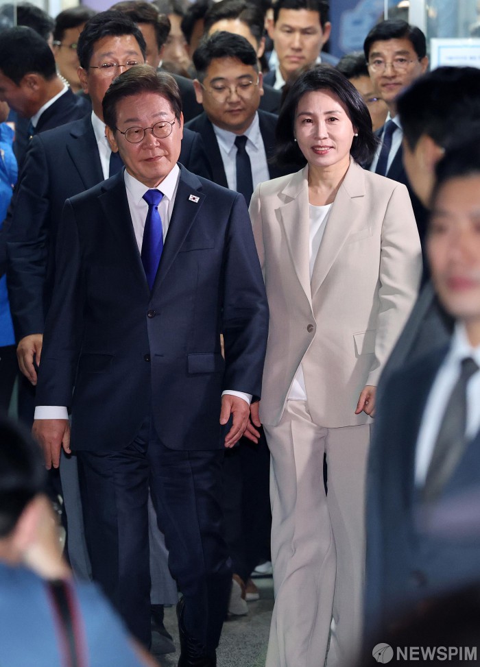 [서울=뉴스핌] 윤창빈 기자 = 제21대 대통령 당선이 확실시되는 이재명 더불어민주당 대선 후보가 4일 서울 여의도 중앙당사에서 나서고 있다. 2025.06.04 pangbin@newspim.com