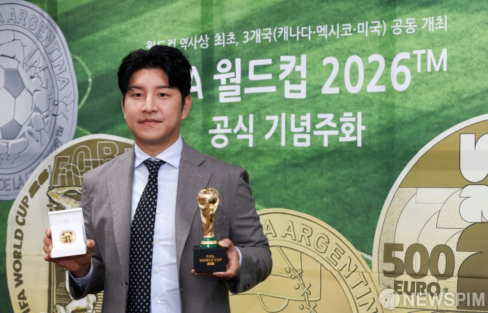 [서울=뉴스핌] 최지환 기자 = 박주호 해설위원이 5일 오전 서울 마포구 월드컵경기장에서 열린 FIFA 월드컵 2026 공식 기념주화 실물 공개 및 발표회에서 2026 공식 기념주화를 선보이고 있다. 2025.06.05 choipix16@newspim.com