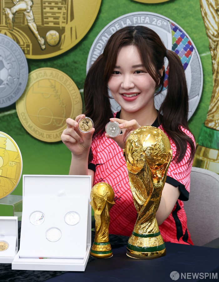 [서울=뉴스핌] 최지환 기자 = 5일 오전 서울 마포구 월드컵경기장에서 열린 FIFA 월드컵 2026 공식 기념주화 실물 공개 및 발표회에서 모델이 월드컵 2026 공식 기념주화를 들어보이고 있다. ㈜풍산화동양행은 ‘FIFA 월드컵 2026 공식 기념주화’의 대한민국 내 공식 판매권자로서 오는 9일부터 2주간 전국 시중은행 및 온라인 쇼핑몰에서 선착순 예약 접수를 통해 기념주화를 판매한다. 2025.06.05 choipix16@newspim.com
