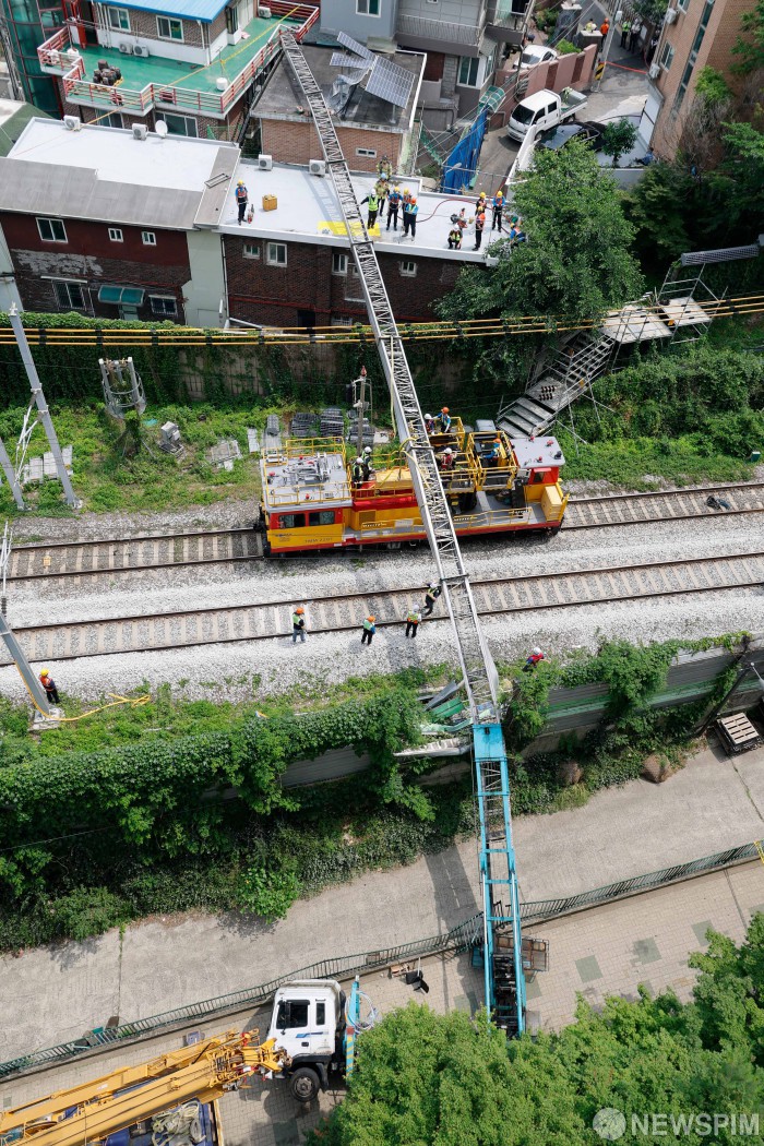 [서울=뉴스핌] 류기찬 인턴기자 = 13일 오전 서울 서대문구 경의중앙선 가좌역∼신촌역 구간 선로 위로 사다리차가 넘어지는 사고가 발생했다. 이 사고로 전기공급 장애가 발생, 열차 운행이 지연되고 있다. 2025.06.13 ryuchan0925@newspim.com