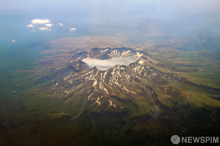 [백두산=뉴스핌] 최지환 기자 = 13일 상공에서 바라본 백두산(2,744m) 천지의 모습. 2025.06.15 choipix16@newspim.com