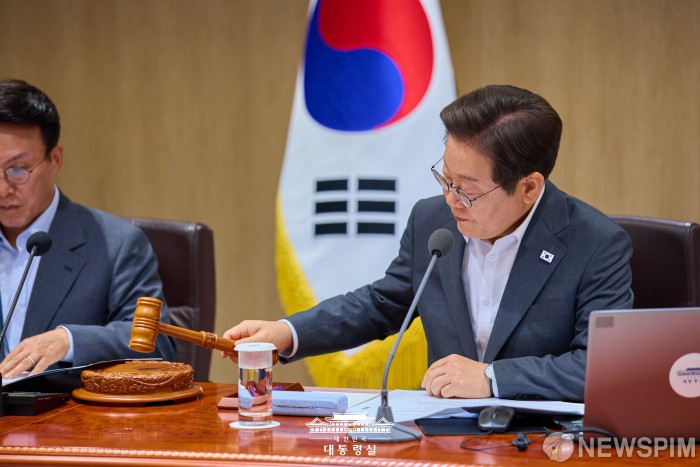 [서울=뉴스핌] 이재명 대통령이 8일 서울 용산 대통령실에서 열린 제30회 국무회의에서 의사봉을 두드리고 있다. [사진=대통령실] 2025.07.08 photo@newspim.com