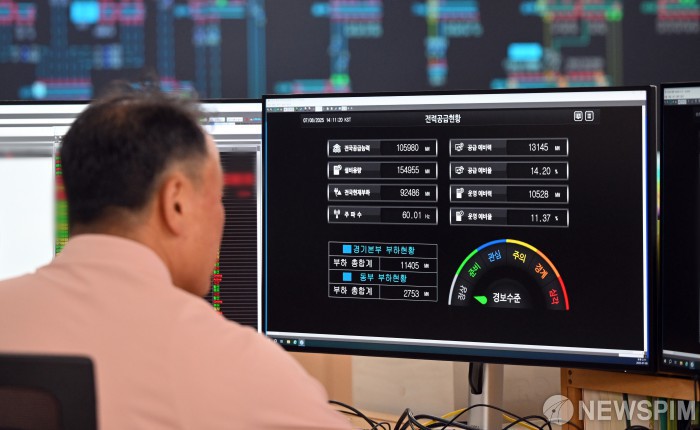 [수원=뉴스핌] 정일구 기자 = 폭염이 이어지며 전력 수요가 급증하고 있는 8일 오후 경기 수원시 영통구 한국전력공사 경기본부 전력관리처 계통운영센터에서 관계자가 전력수급 상황을 점검하고 있다. 8일 전력거래소에 따르면 전날 최대전력은 오후 7시 기준 93.4GW를 기록하며 올여름 최고치를 경신했다. 전력거래소는 이날 오후 5∼6시 국내 최대전력수요가 93.9GW로 올여름 들어 가장 높을 것으로 전망했다. 2025.07.08 mironj19@newspim.com