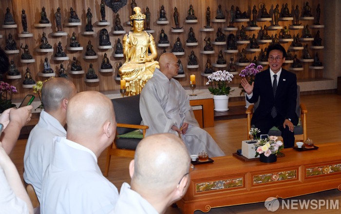 [서울=뉴스핌] 청사 사진기자단 = 김민석 국무총리가 10일 오전 서울 종로구 조계종 조계사 관음전에서 조계종 총무원장(진우 스님) 등 불교계 지도자들을 예방했다. 김민석 국무총리가 진우 스님과 대화하고 있다. 이날 진우 스님을 비롯해 기획실장인 법오 스님, 사회 부장인 진경 스님, 문화부장인 혜공 스님, 사서실장인 일감 스님이 참석했다. 2025.07.10 photo@newspim.com