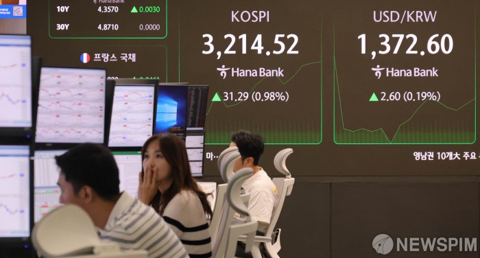 [서울=뉴스핌] 양윤모 기자 = 국내 증시 전체 시가총액이 사상 처음으로 3천조 원을 넘어선 가운데, 11일 오전 코스피가 전장 종가보다 31.29 포인트(0.98%) 상승하며 3214.52로, 코스닥은 7.56포인트(0.05%) 상승한 805.26으로 시작한 가운데, 서울 중구 하나은행 딜링룸에서 직원들이 업무를 보고 있다. 서울외환시장에서 원·달러 환율은 전장 대비 2.60원 상승한 1372.60원에 거래를 시작했다. 2025.07.11 yym58@newspim.com