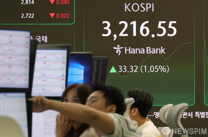 [서울=뉴스핌] 양윤모 기자 = 국내 증시 전체 시가총액이 사상 처음으로 3천조 원을 넘어선 가운데, 11일 오전 코스피가 전장 종가보다 33.32포인트(1.05%) 상승하며 3216.55로, 코스닥은 7.56포인트(0.05%) 상승한 805.26으로 시작한 가운데, 서울 중구 하나은행 딜링룸에서 직원들이 업무를 보고 있다. 서울외환시장에서 원·달러 환율은 전장 대비 2.60원 상승한 1372.60원에 거래를 시작했다. 2025.07.11 yym58@newspim.com