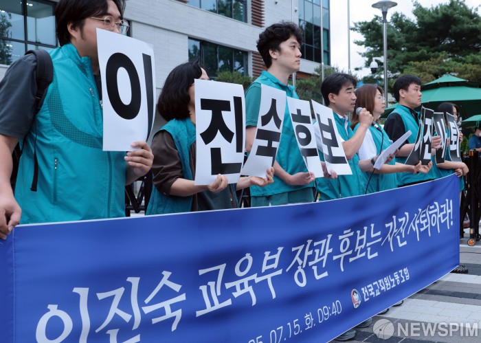 [서울=뉴스핌] 이길동 기자 =전국교직원노동조합(전교조) 조합원들이 15일 서울 종로구 정부서울청사 창성동 별관 국정기획위원회 앞에서 이진숙 교육부 장관 후보자 자진 사퇴 촉구 기자회견을 하고 있다. 2025.07.15 gdlee@newspim.com