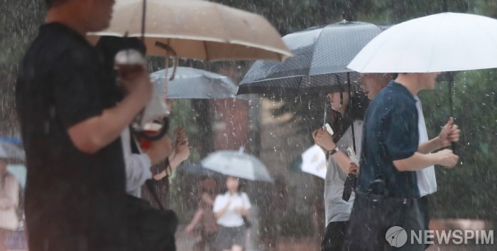 [서울=뉴스핌] 이형석 기자 = 많은 비가 내리고 있는 17일 오전 서울 여의도 인근에서 시민들이 우산을 들고 발걸음을 재촉하고 있다. 2025.07.17 leehs@newspim.com