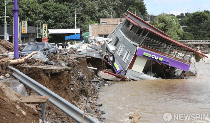[가평=뉴스핌] 이형석 기자 = 21일 오후 경기 가평군 조종면 일대 편의점이 지난밤 쏟아진 집중호우에 지반이 무너져 파손되어 있다. 현재 가평지역에는 사망 2명, 실종자 9명 등 인명피해가 발생했다. 2025.07.21 leehs@newspim.com