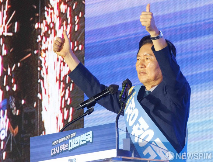 [고양=뉴스핌] 윤창빈 기자 = 정청래 더불어민주당 대표 후보가 2일 오후 경기 고양시 킨텍스에서 열린 제2차 임시전국당원대회에서 인사를 하고 있다. 2025.08.02 pangbin@newspim.com