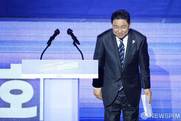 [고양=뉴스핌] 윤창빈 기자 = 김병기 더불어민주당 대표 직무대행 겸 원내대표가 2일 경기 고양시 킨텍스에서 열린 제2차 임시전국당원대회에서 당원들을 향해 인사하고 있다. 2025.08.02 pangbin@newspim.com