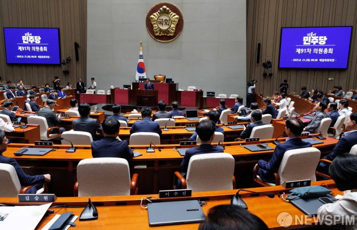 [서울=뉴스핌] 윤창빈 기자 = 정청래 더불어민주당 대표가 21일 오전 서울 여의도 국회에서 열린 의원총회에서 모두발언을 하고 있다. 2025.08.21 pangbin@newspim.com