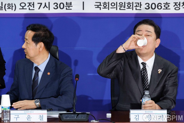 [서울=뉴스핌] 윤창빈 기자 = 김병기 더불어민주당 원내대표가 26일 오전 서울 여의도 국회 의원회관에서 열린 2026년 예산안 당정협의에서 물을 마시고 있다. 왼쪽은 구윤철 부총리 겸 기획재정부 장관. 2025.08.26 pangbin@newspim.com