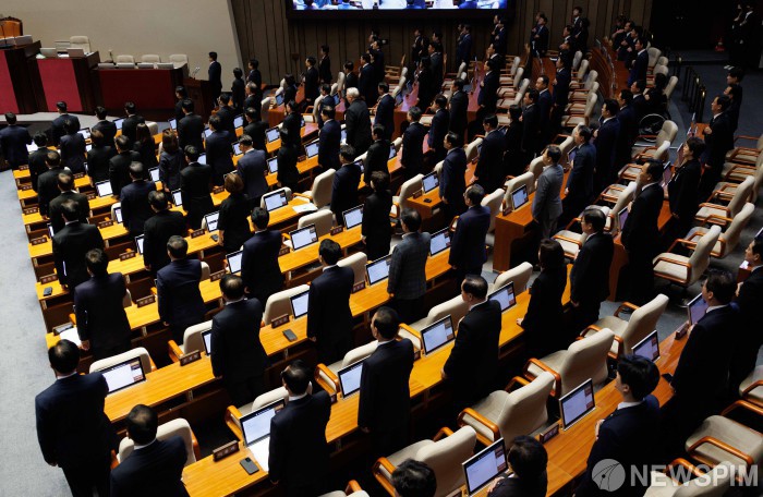 [서울=뉴스핌] 윤창빈 기자 = 1일 오후 서울 여의도 국회에서 열린 제429회국회(정기회) 개회식에서 의원들이 국민의례를 하고 있다. 이날 우원식 국회의장 및 더불어민주당은 한복을, 국민의힘은 상복을 입고 참석했다. 2025.09.01 pangbin@newspim.com