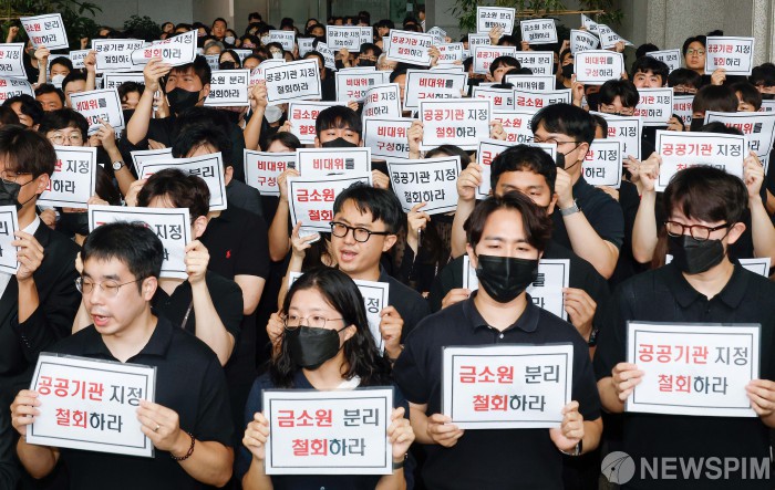 [서울=뉴스핌] 류기찬 기자 = 금감원 노조 조합원들이 9일 오전 서울 여의도 금감원 본원 로비에서 금융감독체계 개편에 반대하는 손피켓을 들고 시위를 하고 있다. 2025.09.09 ryuchan0925@newspim.com