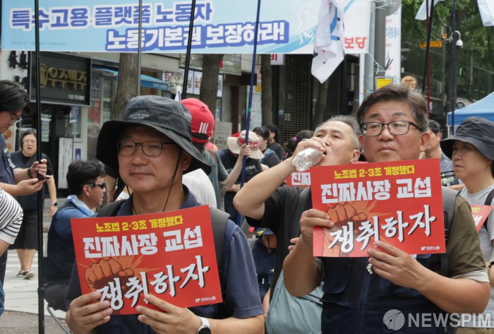 [서울=뉴스핌] 양윤모 기자 = 13일 오후 민주노총이 서울 중구 지하철 시청역 7번 출구 일대에서 양경수 위원장과 조합원 5천명이 참석한 가운데 ‘9·13 민주노총 결의대회’를 개최했다. 민노총은 특수고용·플랫폼 노동자 보호 입법 보완을 요구하고, 노정교섭 제도 구축과 회계공시·타임오프제 폐지를 촉구했다. 또한 미국 트럼프 정부의 대한민국 노동자 불법 체포 및 경제 수탈 정책을 규탄했다. 2025.09.13 yym58@newspim.com